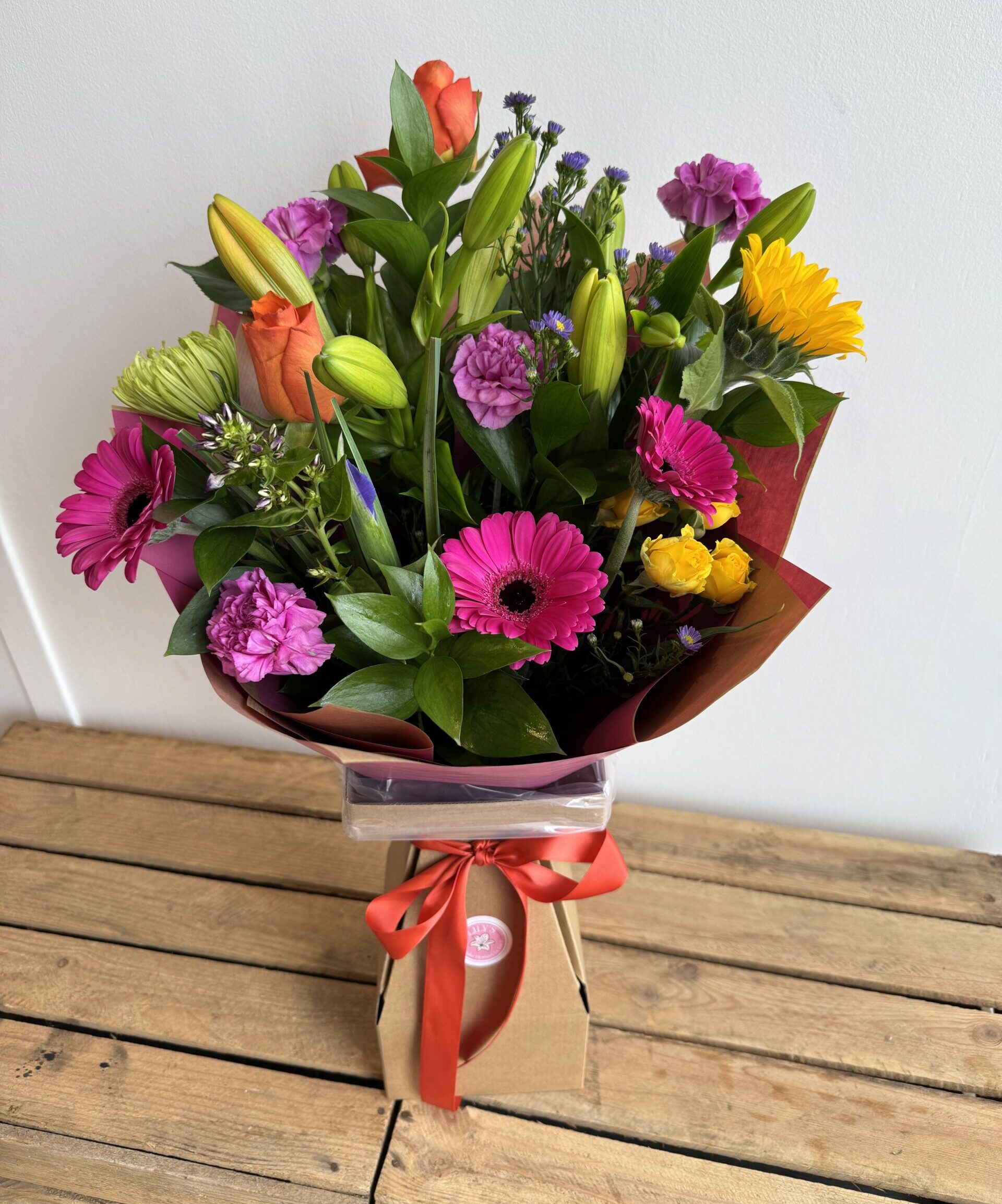 This weekends bright and cheerful bunches contains colourful lilys, roses, spray roses, chrysanthemum bloom, germinis, carnations, sunflower, phlox, iris, aster and foliage.